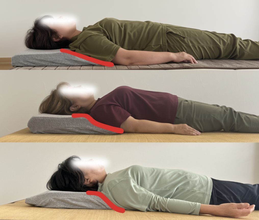 なぜ「背中」に枕が必要なのか?Clinical Pillowが全身をリラックスさせる仕組みBy anomakura / 2026年1月19日 「色々な枕を試したけれど、リラックスできない……」その原因は、首から下にあるかもしれません。前回、仰向けでリラックスできない2つの理由(ブリッジ活動と背中の丸み)についてお話ししました。今回は、それらにどう対処して「全身の脱力」を導き出すのか、Clinical Pillow(あのまくら)の製作手順と理論を解説します。 1. 製作に使うものClinical Pillow™️ 枕製作キット あのまくらは、ただ測るだけではなく、寝ている状態の身体に適合させながら、その場での反応(評価)を繰り返して作ります。特許技術: 部材の組み合わせにより、傾斜角度・長さ・高さを個別に調整し、即座にその人に最適な形状を造形できます。 2. 背中の「浮き(ブリッジ活動)」 への対処 運動学や神経学に基づき、反って浮いてしまう部分を床に接地させるよう誘導します。仕組み: 枕の傾斜部を「楔(くさび)」のように挿入し、体重を移動させることで、腰や背中を床に接地させます。脳への反応: 浮いていた部分が床に触れると、脳に「床に着いた」という感覚(固有感覚)が伝わり、緊張(ブリッジ活動)が脱力(支持活動)へと変わります。 3. 背中の「丸み(猫背)」への対処 背中の丸みは、枕の高さや首の緊張に直結します。なぜ仰向けでも丸まったままなのか?: 理由は2つあります。1つは「反り腰のカウンター」として必要だから。もう1つは「背中を床に預ける感覚イメージ」がないため、筋肉の力みが抜けないからです。 対処法: 背中の形状にピッタリとフィットする枕を使うことで、身体が「体重を預けていいんだ」と学習し、重力方向への脱力が促されます。これにより、「胸が開く感じ」や「呼吸が深くなる感じ」へと導かれます。 背中の形状がフィットしたClinical Pillowを使って寝ると、どんどん平らな形状に背中を預けられるようになっていきます(短期的には10分寝るだけで少し変わるし、長期的には骨格や姿勢パターンの変化もみられます)定期的にClinical Pillowを再調整し、より低い傾斜に調整していくことで、猫背の改善は加速していきます。 ホームに戻る 最近のコメント